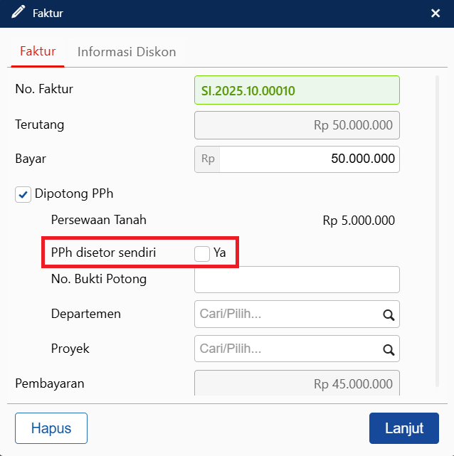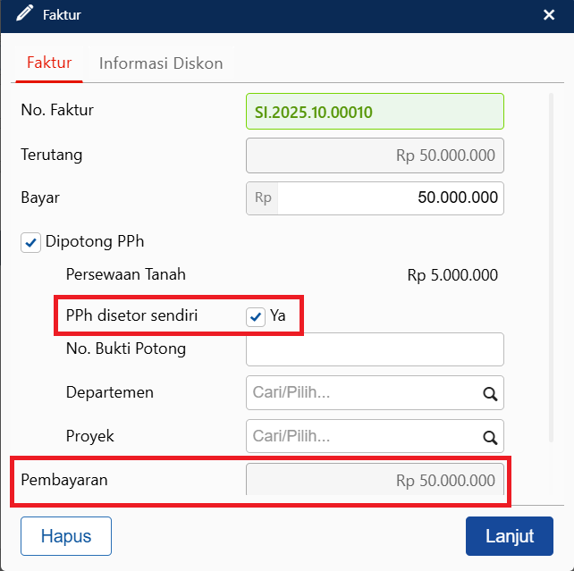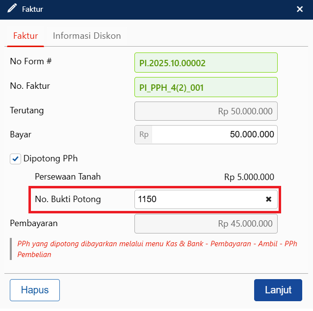 - Membuat Pembayaran Pembelian / Penjualan, kemudian pilih nama Pemasok/Penjual-nya dan pilih Nomor Faktur yang dimaksud, maka akan tampil informasi pemotongan PPh Pasal 4 Ayat 2, sesuai dengan tarif-nya. Silakan isikan nomor bukti potong nya, setelah klik itu Lanjut dan lakukan penyelesaian atas transaksi Pembayaran Pembelian/Penjualan tersebut.