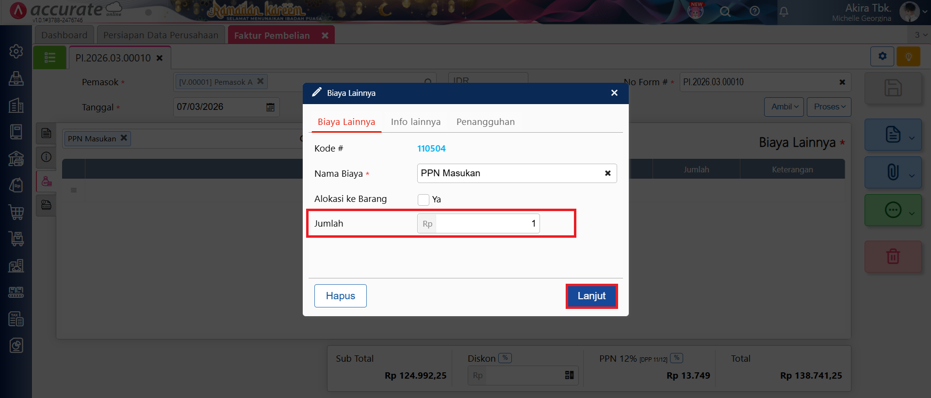 - Selanjutnya ke tab Biaya Lainnya, lalu pilih akun PPN Masukan pada kolom Cari/Pilih Akun Perkiraan, dan inputkan nilai selisih PPN nya. Pada contoh ilustrasi ini adalah sebesar Rp 1.