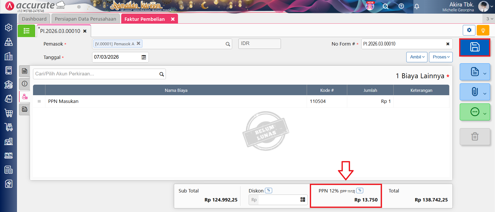 - Sehingga nilai PPN Masukan pada Faktur Pembelian di Accurate Online sudah sama dengan nilai PPN yang dilaporkan oleh pemasok.