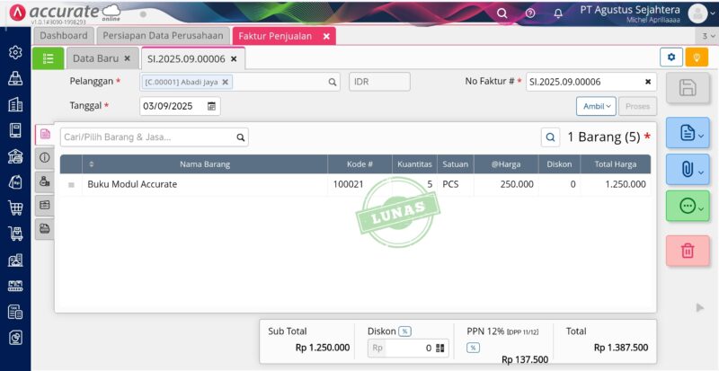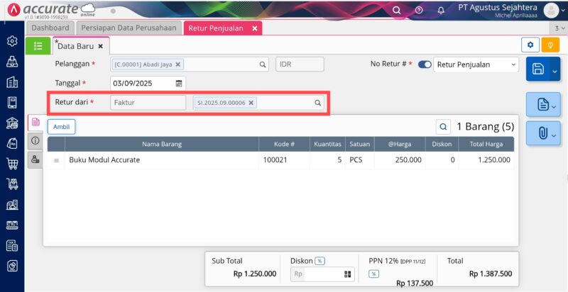 - Pilih Pelanggan yang dimaksud dan lengkapi informasi lainnya, kemudian pilih Nomor Faktur Penjualan yang di retur (nilainya negative) dan Nomor Faktur Penjualan yang akan dilunasi.