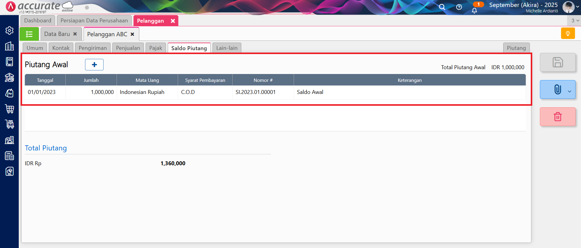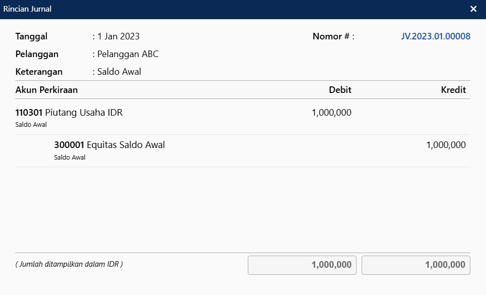- Saldo awal piutang pelanggan berfungsi untuk mencatat nilai piutang pelanggan perusahaan sebelum menggunakan Accurate. Hanya nilai Piutang saja, tidak berkaitan dengan nilai penjualan dari pelanggan tersebut.