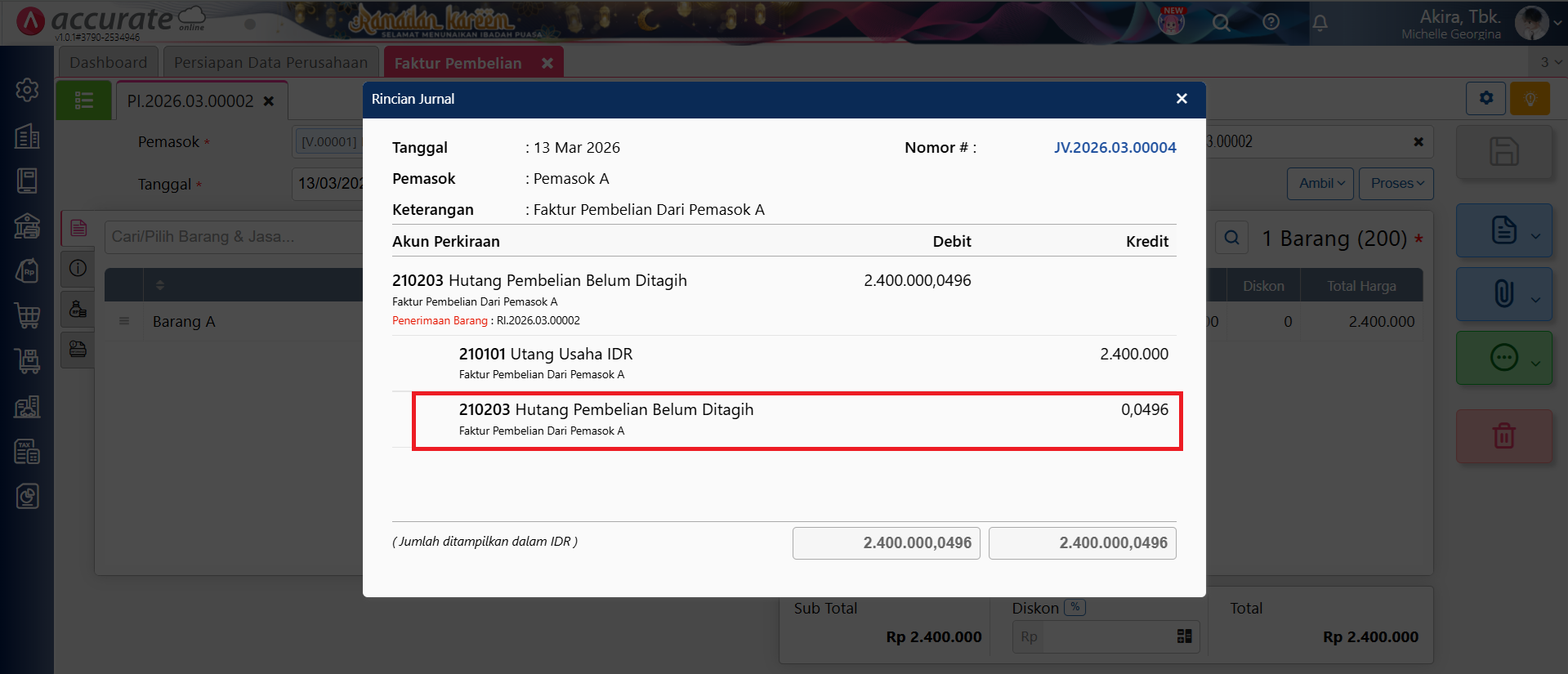 Cara perhitungan selisih nilai sebesar (Rp 0,0496) dan (Rp 0,244) yang tampil pada jurnal transaksi Faktur Pembelian tersebut, bisa Anda lihat disini.