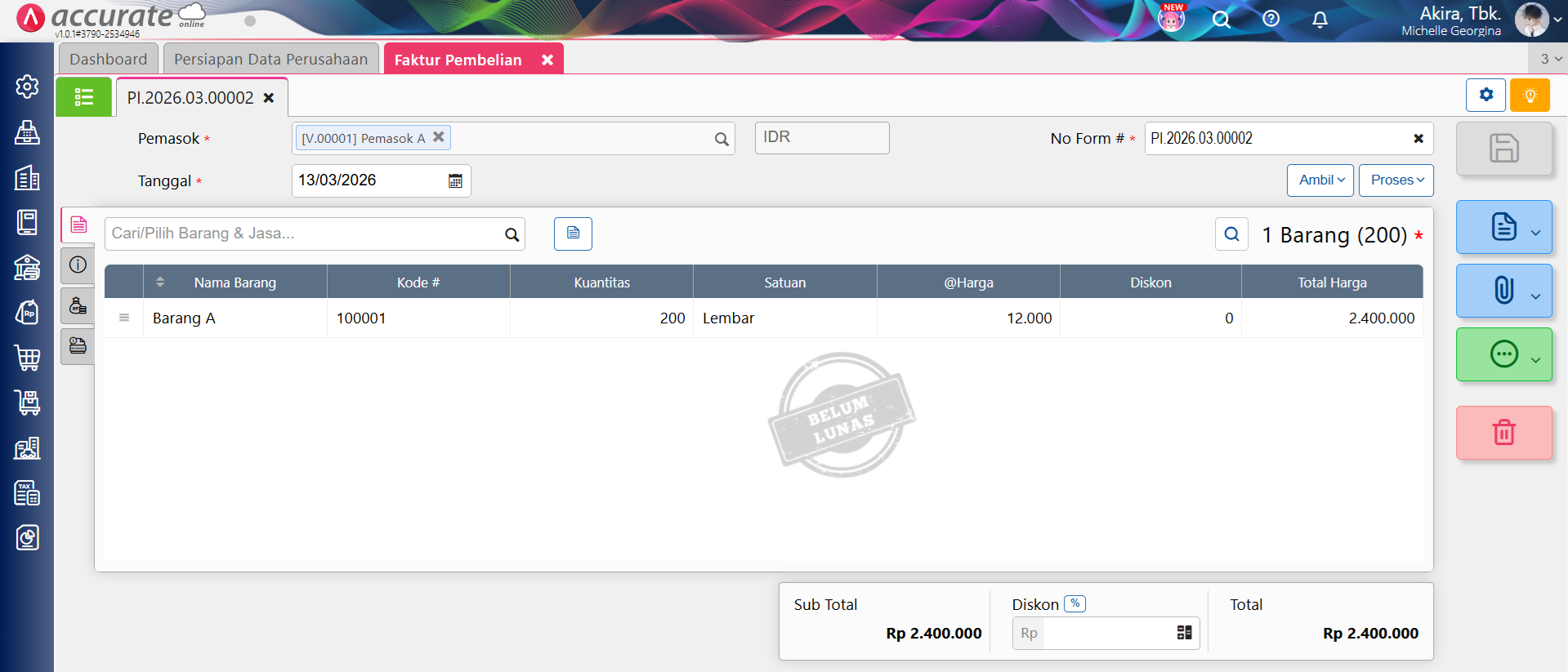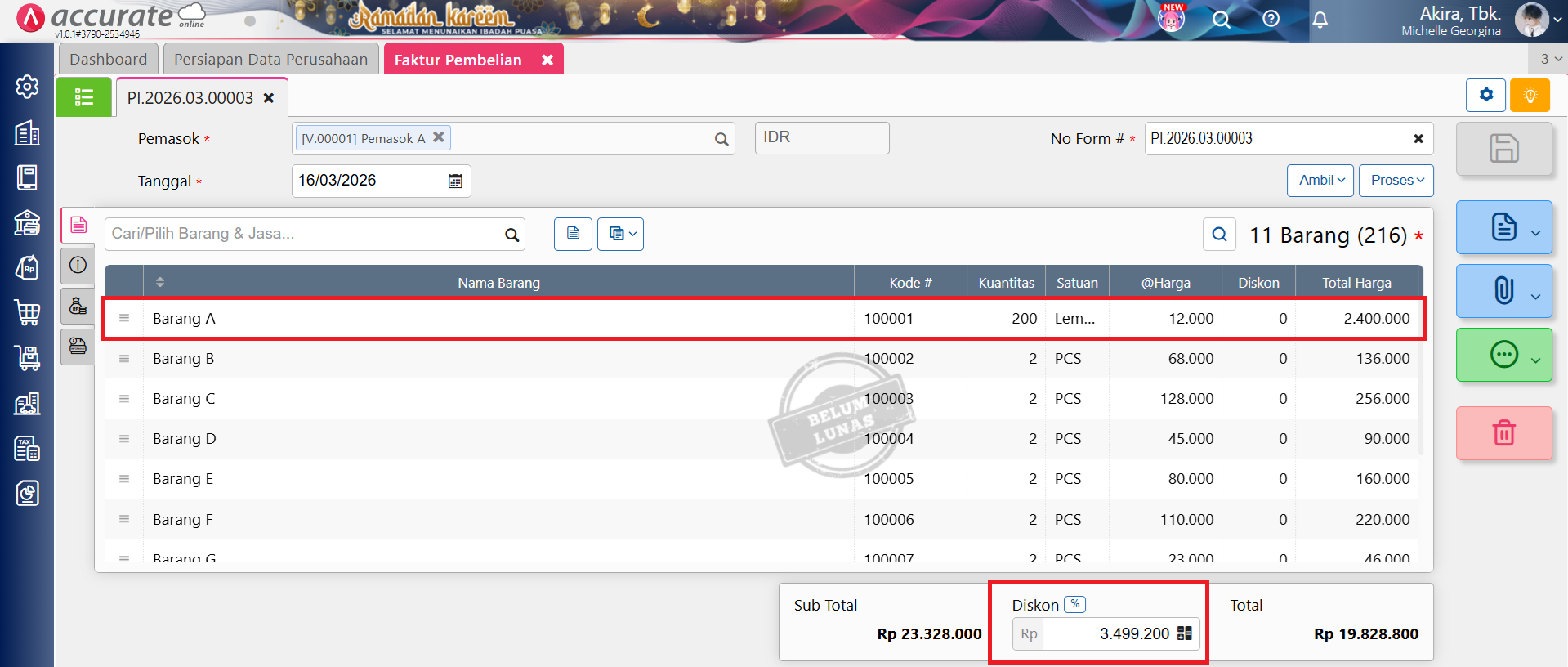 Ilustrasi 2: Melakukan penerimaan barang dengan satuan kedua yang diproses ke faktur pembelian dan terdapat nilai diskon faktur, misal Barang A sebanyak 200 Lembar dari Pemasok A, dengan nilai @Rp 12.000 dan nilai diskon faktur sebesar Rp 3.499.200.