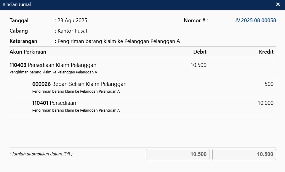 Atas transaksi Klaim Pelanggan ‘Kirim Barang’ tersebut akan terdapat selisih nilai persediaan sebesar Rp 500. Selisih nilai ini akan ditampung ke akun yang telah ditentukan, dalam illustrasi adalah akun Beban selisih Klaim Pelanggan.