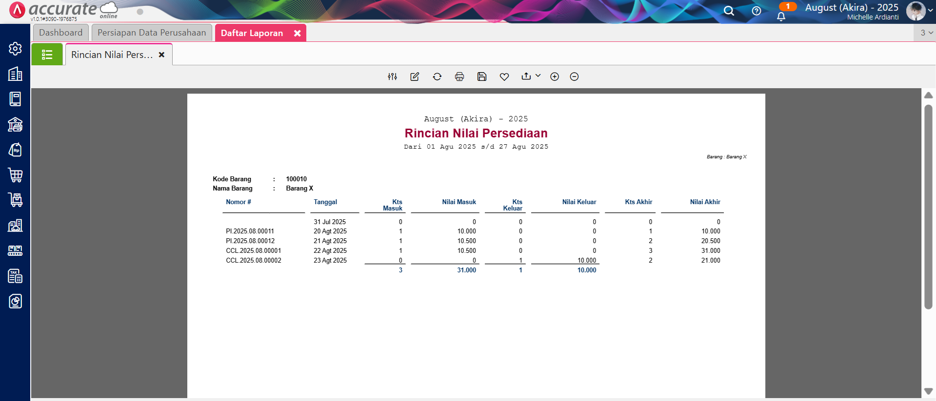 - Pada tanggal 22 Agustus 2025 terjadi transaksi Klaim Pelanggan ‘Terima Barang’ mengambil nilai persediaan sebelum transaksi Klaim Pelanggan (nilai persediaan terakhir saat itu), yaitu Rp 10.500