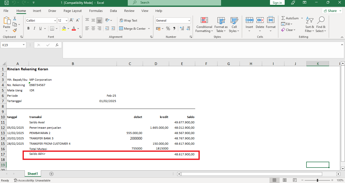 Sedangkan untuk melihat saldo Rekening Bank, silahkan cek pada saldo akhir file csv yang telah diimpor ke Accurate Online.