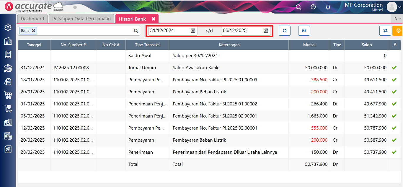 Sehingga untuk melakukan pengecekan terkait saldo Jurnal Accurate, silahkan lihat dari menu Kas & Bank | Histori Bank dengan mengatur tanggal dari mulai database hingga tanggal hari ini.