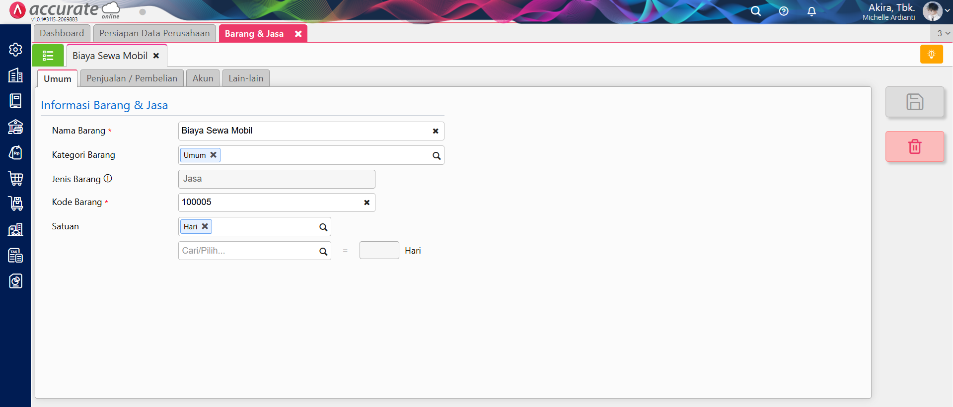 - Buat Barang dengan tipe persediaan adalah ‘Jasa’ dan buat sesuai dengan jumlah jasa yang ada, misalnya adalah Jasa Sewa Mobil dan Jasa Supir dan isikan dengan akun biaya serta pendapatan jasa yang sesuai pada tab Akun-nya.