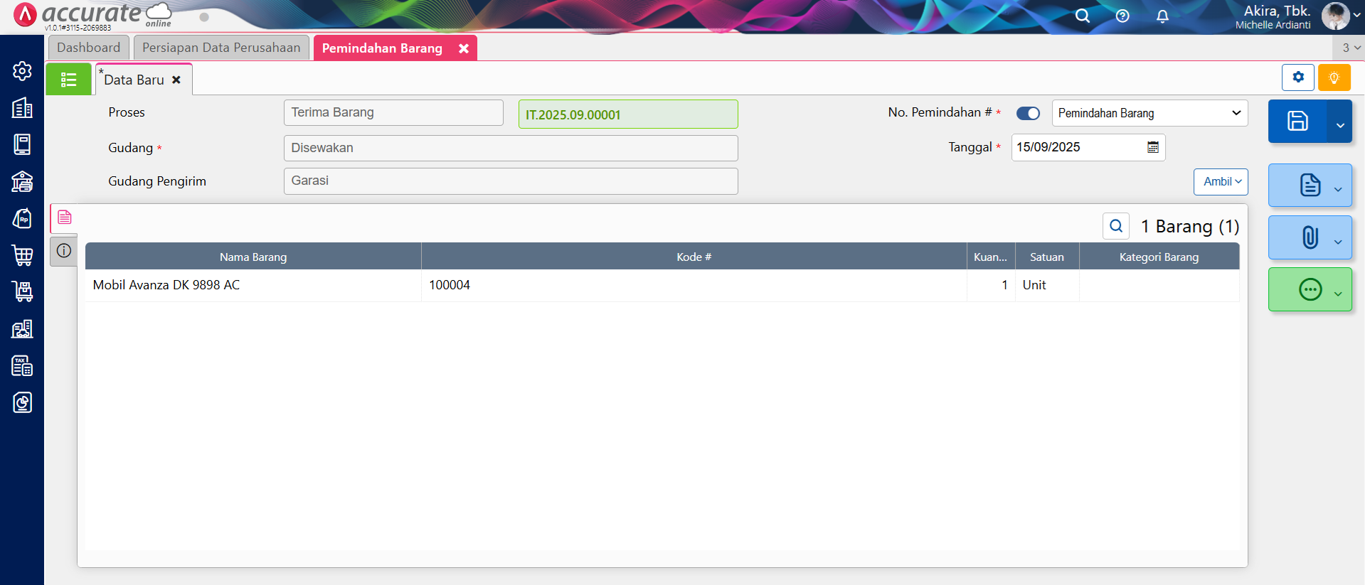 - Lakukan Pemindahan Barang untuk mobil yang sedang disewakan ke Gudang Disewakan, agar bisa terlihat Mobil yang tersedia untuk disewakan di Gudang Garasi. Panduan Pemindahan Barang bisa ikuti panduan berikut : Pemindahan Barang & Penerimaan Barang.