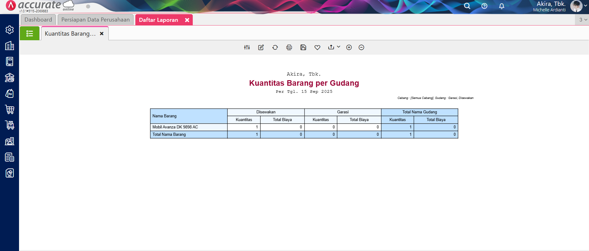 - Untuk melihat Mobil apa saja yang tersedia untuk disewakan, anda bisa melihatnya melalui laporan Kuantitas Barang per Gudang yaitu di Gudang Garasi. Laporan Kuantitas Barang Per Gudang bisa diakses melalui menu Daftar Laporan | Daftar Laporan | Gudang.