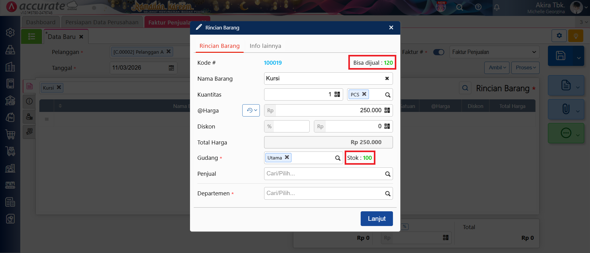 Informasi stok bisa dijual dan stok gudang pada rincian barang faktur penjualan