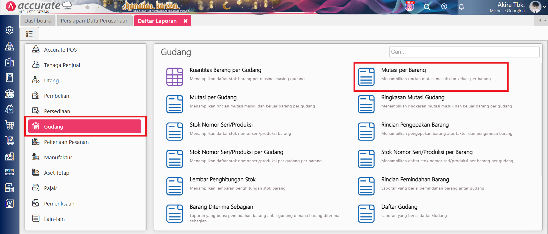 - Buka Laporan Mutasi per Barang dari menu Daftar Laporan | Daftar Laporan | Gudang.
