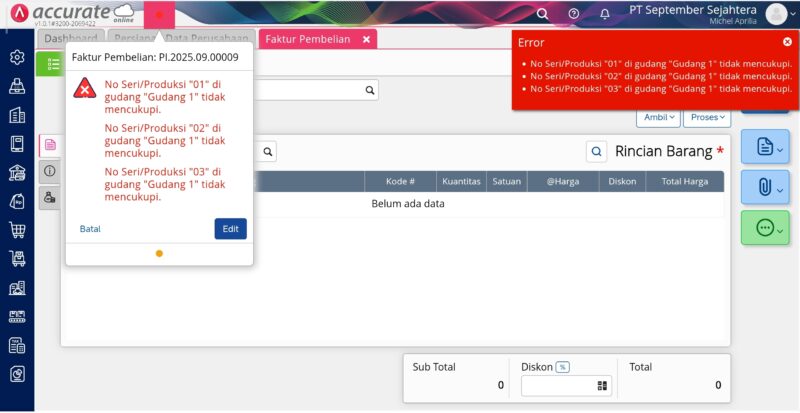 Tampilan Eror Saat Hapus Penerimaan Barang di Faktur Pembelian