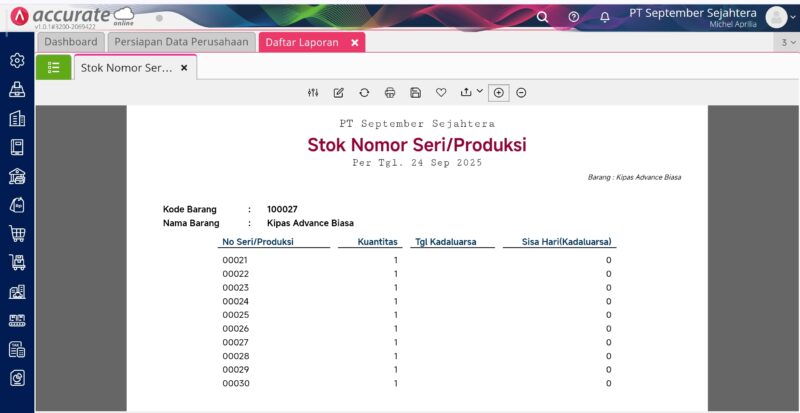 Anda bisa melakukan pengecekan atas ketersediaan nomor seri tersebut melalui Laporan Stok No Seri/Produksi yang bisa diakses pada menu Laporan | Daftar Laporan | Gudang. Pada laporan Stok No Seri/Produksi menyajikan informasi barang dengan nomor seri yang tersedia pada Gudang tertentu.