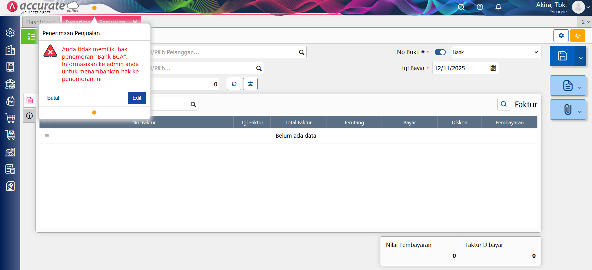 Jika ada kondisi simpan transaksi yang berkaitan dengan Kas/Bank (contoh: Peneriman Penjualan) tampil error sebagai berikut: