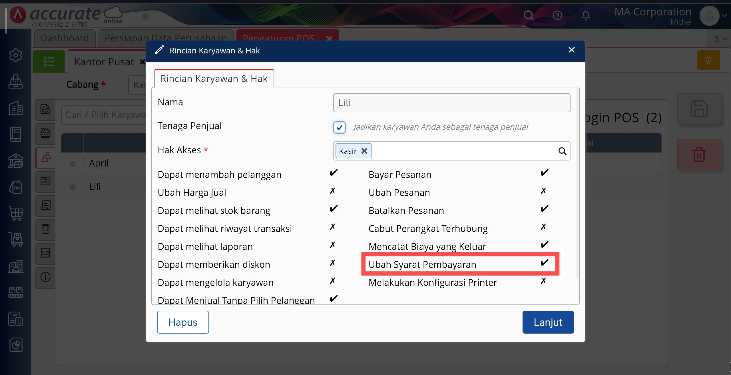 - Pastikan pada rincian karyawan & hak dari karyawan tersebut untuk peran Ubah Syarat Pembayaran sudah tercentang.