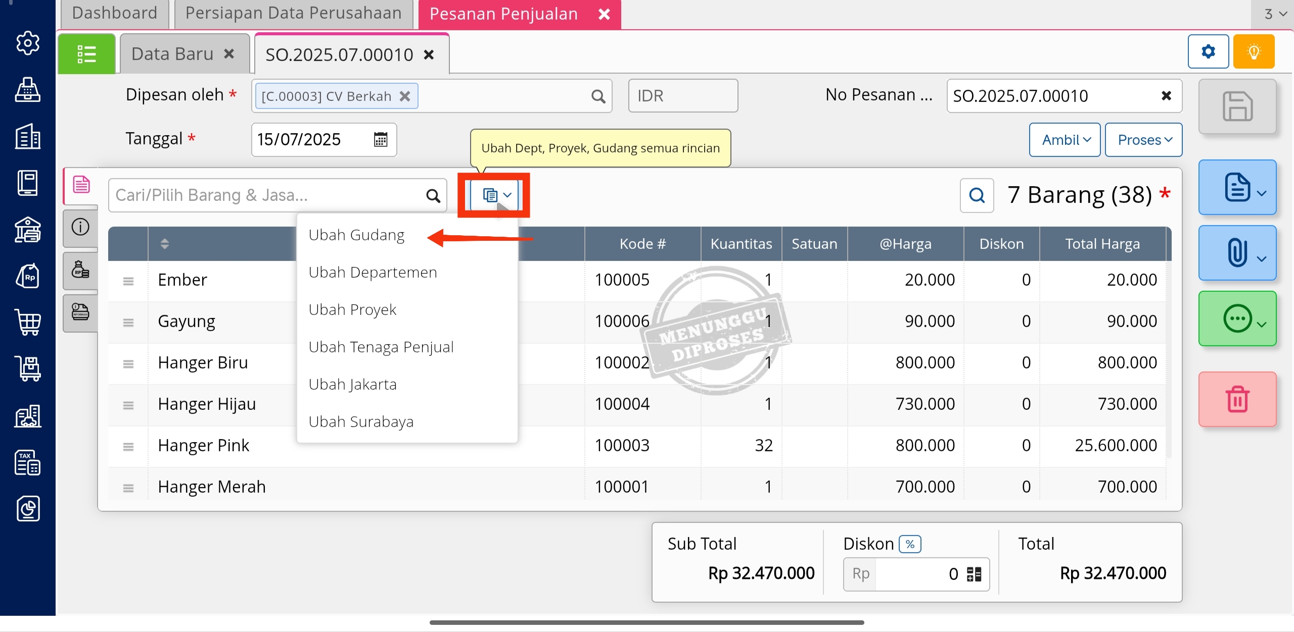 - Kemudian klik tombol “Ubah Dept, Proyek, Gudang semua rincian”, dan pada ilustrasi ini, pilih Ubah Gudang.