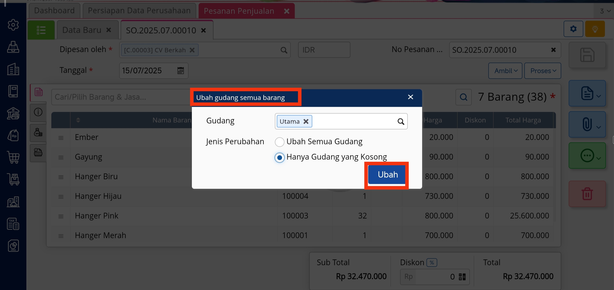 - Pada kotak Ubah gudang semua barang, pilih Gudang yang diinginkan dan pilih Jenis Perubahan Hanya Gudang yang kosong. Lalu klik Ubah.